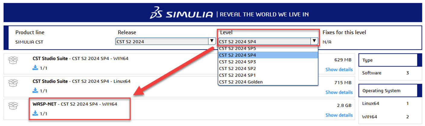 Example: At the time of this QA, SP4 is the latest available WASP-NET version, so select "Release = CST S2 2024" and "Level = CST S2 2024 SP4" to find the latest WASP-NET version. In contrast to CST, it is not necessary to install the 2024 golden version first.